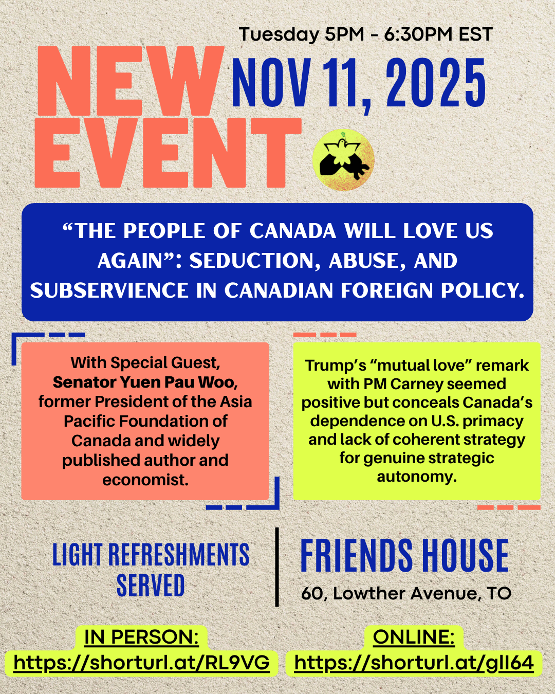 Thank you, Richard Sandbrook, for the invitation to speak at tonight’s meeting of Science for Peace. I note that we are gathered at “Friends House” in Toronto, which I suppose is appropriate for a speech entitled “The People of Canada will Love us Again”. But as you know, the subtitle of my presentation is “Seduction, Abuse and Subservience in Canada-US Relations”, which means I will be talking about distorted views of friendship between Canada and the United States, and in our international relations more generally.